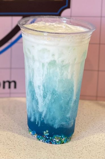 Sprite, grape, coconut, vanilla, cream, whipped cream and galactic sprinkles