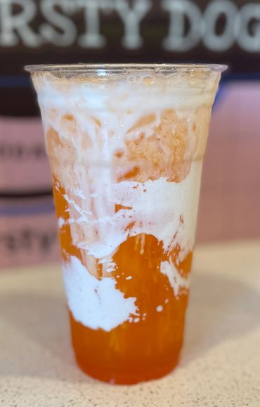 Orange soda, marshmallow fluff swirl in cup, orange, vanilla and cream